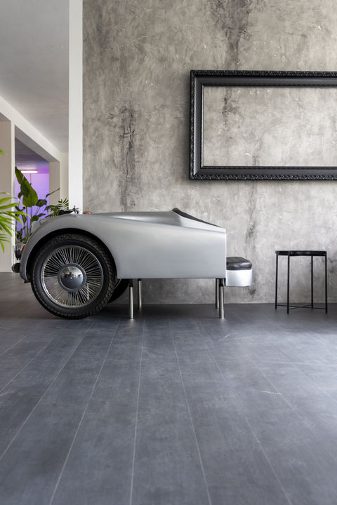 Gli oggetti scelti per l'arredo sono un mix di vecchio e nuovo: la riproduzione di una Jaguar in vetroresina, pezzo unico di un artigiano della Brianza, la Moto Guzzi originale del 1982, una delle prima a cardano, che ha fatto la storia del motociclismo italiano, il biliardino Garlando edizione limitata "pure white" con omini bianchi e neri e manici in simil-mogano.